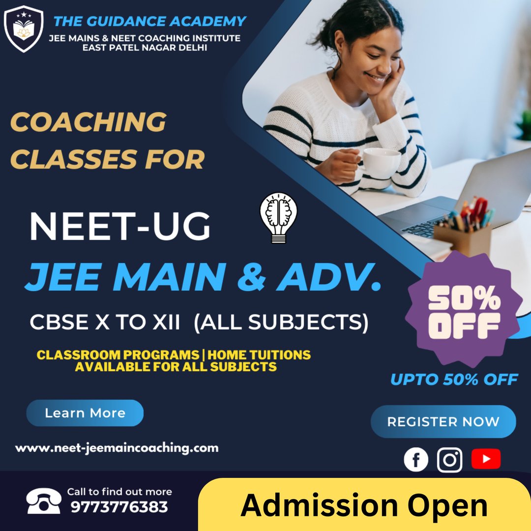 The Guidance Academy is a leading coaching centre located in East Patel Nagar, Delhi, specializing in preparing students for NEET-UG, IIT JEE, and CBSE X, XI, and XII Board exams. They offer expert coaching classes for JEE, NEET, and CBSE physics, chemistry, math, biology, and English, catering to students from Class X to XII. Our Special Features: 1. IIT JEE coaching in Patel Nagar, Delhi. 2. NEET-UG coaching in Patel Nagar, Delhi. 3. 12th Physics Coaching in East Patel Nagar, Delhi. 4. 12th Chemistry Coaching in East Patel Nagar, Delhi. 5. 12th Maths Coaching in East Patel Nagar, Delhi. 6. 12th Biology Coaching in East Patel Nagar, Delhi. 7. 11th Physics, Chemistry, Math, and Biology Coaching in East Patel Nagar, Delhi. Call us today!